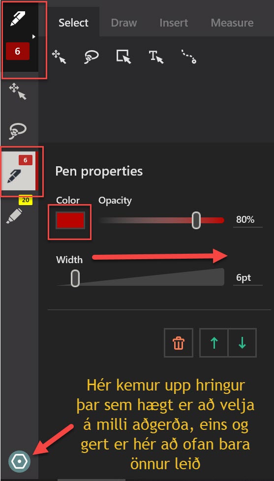 Ef ég ætla að skrifa með penna á skjáinn þarf ég að velja pennann, hversu breiður hann á að vera, litur o.s.frv. Númerið sem kemur við pennann er þykktin á skriftinni. Muna að ef penninn virkar ekki á þessu stigi þarf að velja touchpad við settings (færð það fram með því að ýta á strikin þrjú efst í vinstra horninu). Undo/redo hnappar koma fram með því að renna yfir skjalið