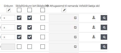 Hægt er að gefa einkunn í bókstöfum í INNU. ATH. samt að ef gefið er fyrir í bókstöfum reiknast það eðlilega ekki inn í einkunnaregluna þar sem það eru engin töluleg gildi til að reikna. Þetta reiknast ekki sem 0 af því núll er tölulegt gildi en bókstafur er það ekki og það kemur þá bara eyða. Hér hefur verið notað S fyrir skilað en það er hægt að nota hvaða bókstaf sem er.