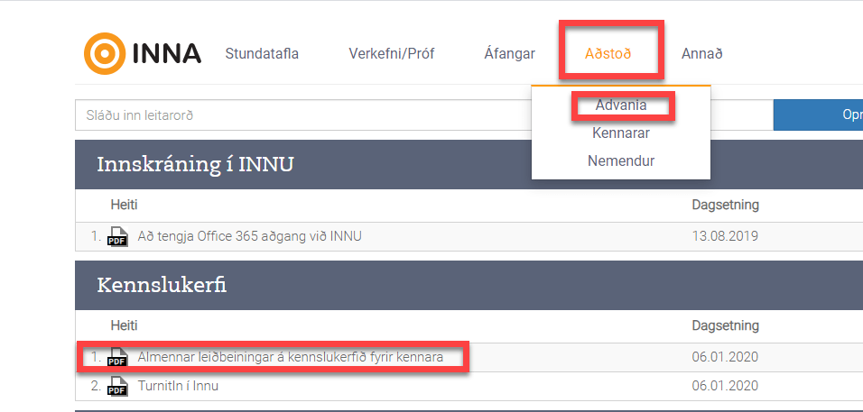 INNA er kennslu eða námsumsjónarkerfið sem flestir framhaldsskólarnir nota. Leiðbeiningar á INNU frá Advania eru undir hnappnum Aðstoð/Advania. Um að gera að skoða þar hvort þar er að finna leiðbeiningar við því sem leitað er að. Hér fyrir neðan myndina eru tenglar á leiðbeiningar í INNU sem ég hef sett upp og endilega að hnippa í mig ef það vantar inn efni.