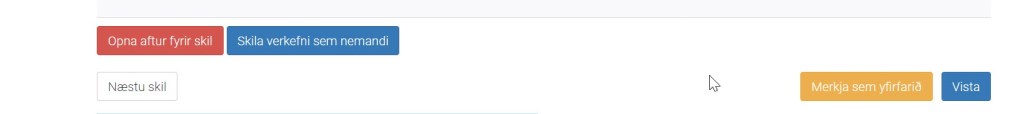 Það kemur fyrir að nemendur skila verkefnum aftur sem búið er að gefa fyrir. Þá birtist verkefnið sem óyfirfarið á forsíðu INNU. Til þess að losna við það ef ekki á að breyta einkunn þarf að opna verkefnið og velja að búið sé að yfirfara verkefnið.