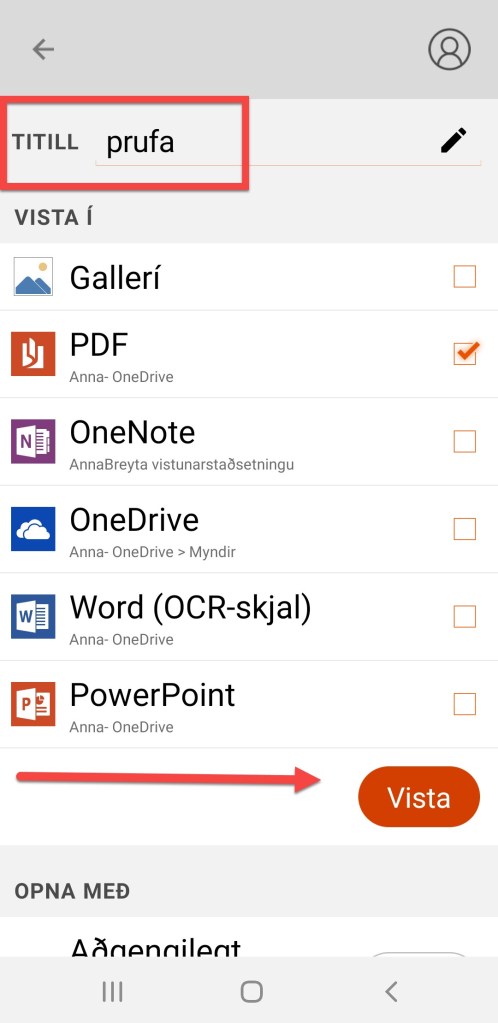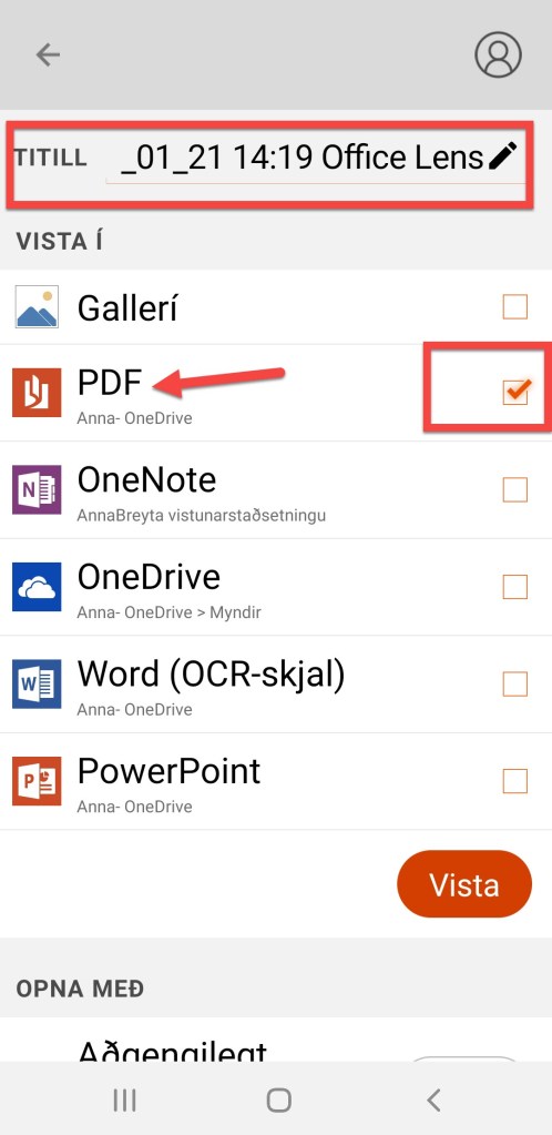 Það er mjög mikilvægt að hafa hakað við að þetta eigi að vera PDF skjal. Þá fer það beint í One-Drive og þaðan er hægt að senda það á Innu í rétt skilahólf. OfficeLens gefur skjalinu eitthvað óskiljanlegt nafn en hægt er að breyta því með því að smella á pennann og skrifa í reitinn.