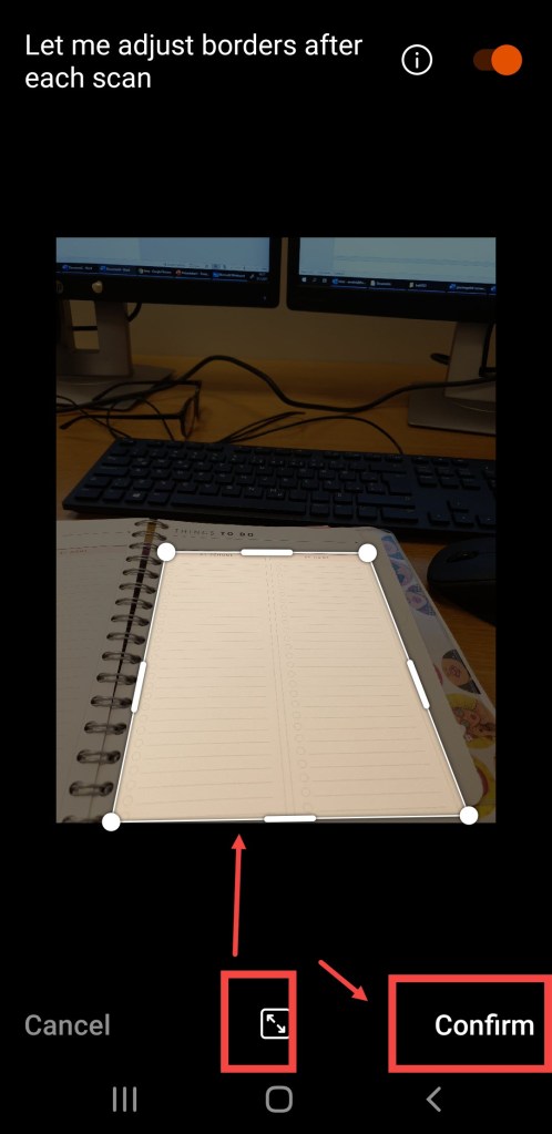 Þegar smellt er á skönnunarhnappinn þá þarf að staðfesta eða laga skjalið ef það er bjagað eins og á næstu mynd. Hægt er að laga með því að smella á hornið eða nota örvahnappinn og þá er hægt að stilla eins og hver vill. Ef skjalið er í lagi þá er smellt á CONFIRM.