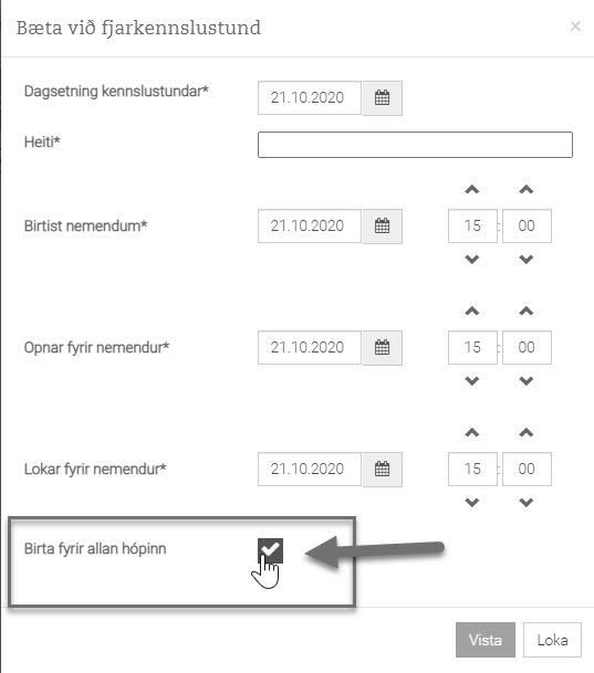 Fara í Fjarkennsluflipann og bóka kennslustund. Kennari ákveður sjálfur hversu langan tíma hver nemandi á að fá, fimm til tíu mínútur hver nemandi. Ágætt að nota bara stafrófsröðina við bókun þannig að þegar A er búinn tekur B við og svo framvegis.